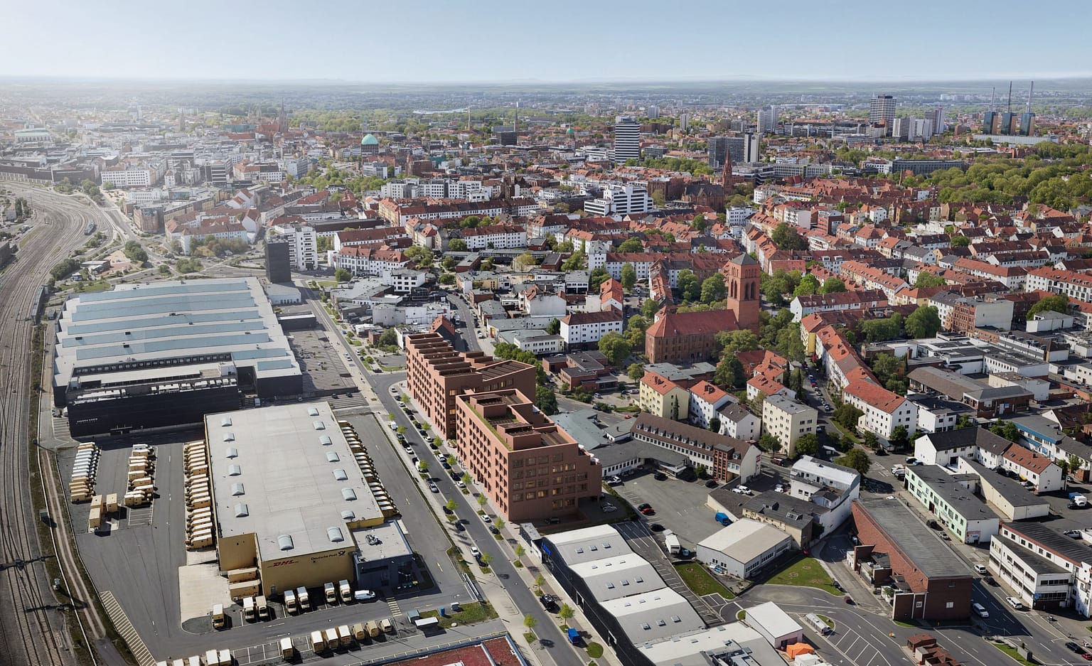 In erstklassiger Lage im aufstrebenden Stadtteil Hannover-Nordstadt, zentrumsnah und verkehrsgünstig gelegen, entstehen auf fünf Vollgeschossen zwei architektonisch verbundene Bürogebäudeteile – das IQ Innovationsquartier Hannover.