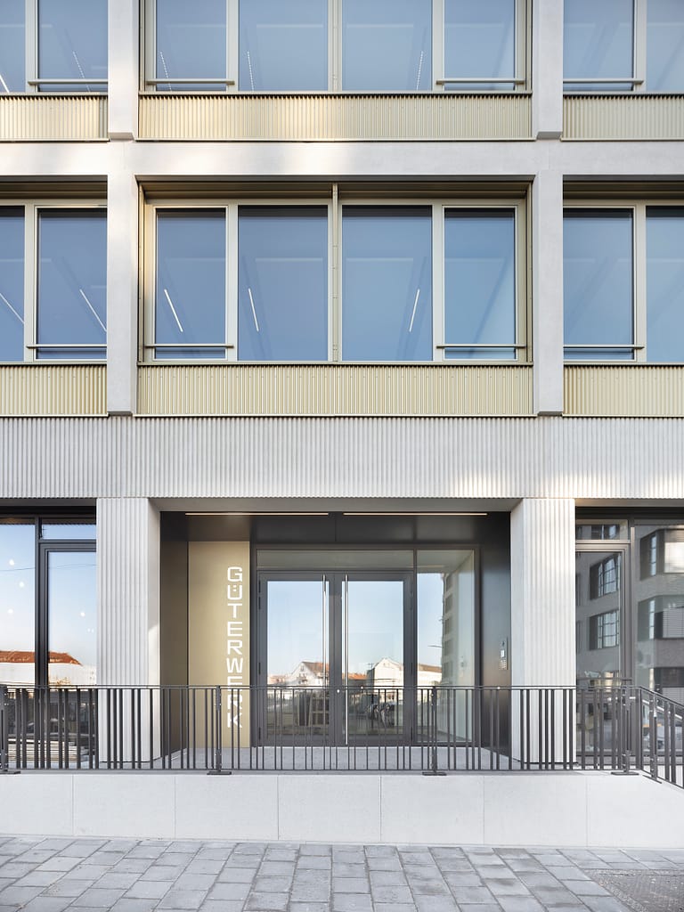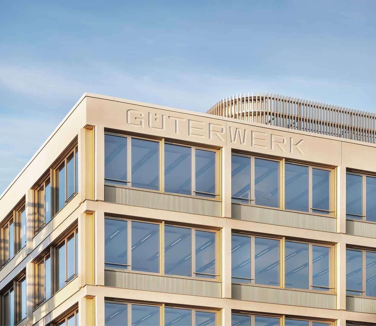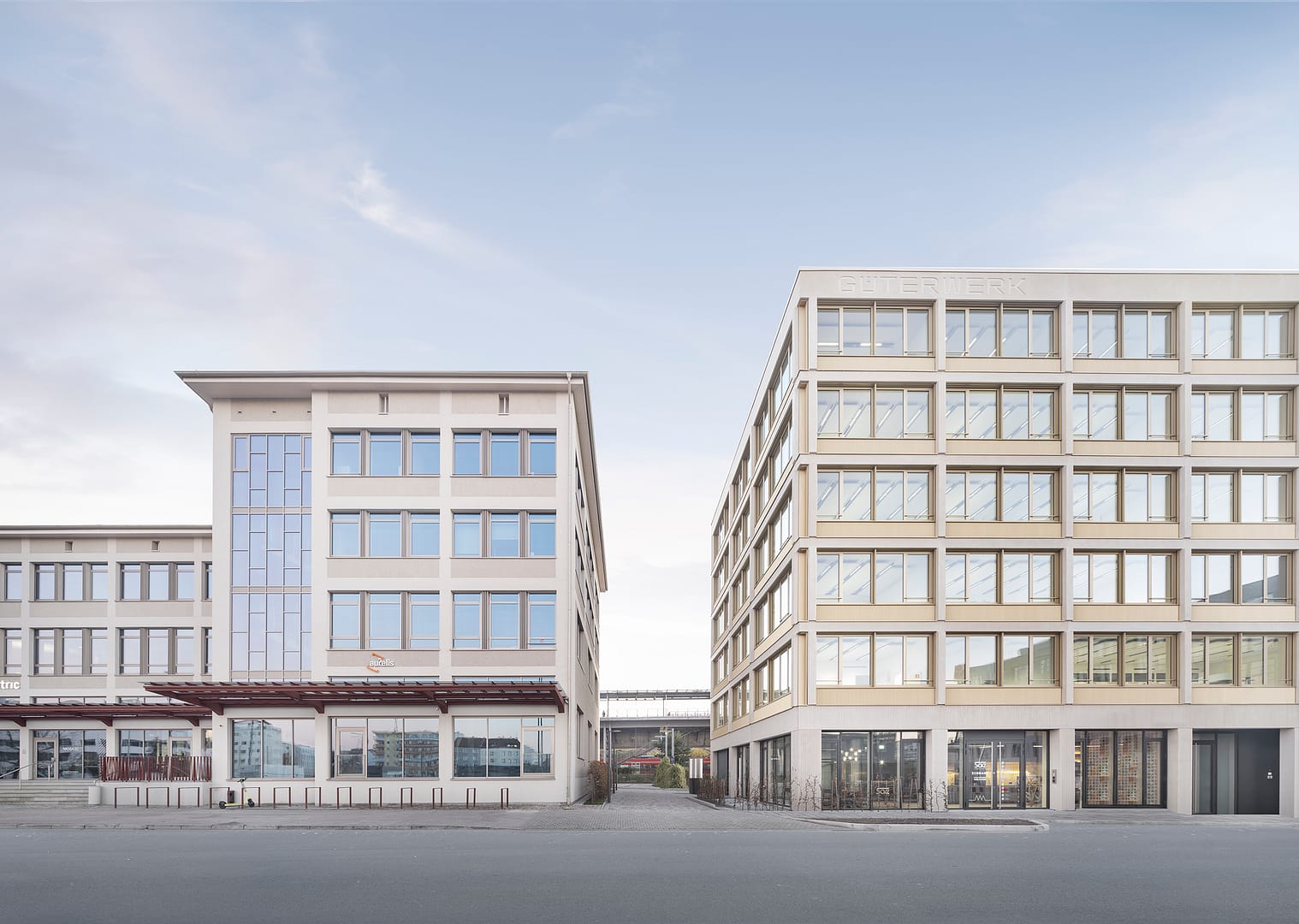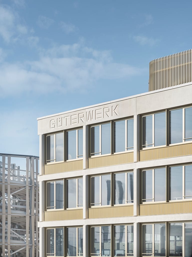 Das sachlich und raffiniert wirkende GÜTERWERK ist ein architektonischer Akzent, der das Quartierkonzept markant betont. Mit der Fassade aus Stahlbetonfertigteilen hat das Nürnberger Büro Baum-Kappler Architekten eine Analogie zum einst rein industriell genutzten Standort geschaffen. Brüstungsverkleidungen aus bronzefarbenem Profilblech verleihen dem sonst geradlinigen Gebäude eine facettenreiche Gestalt. Hinter der eleganten Hülle können auf fünf Obergeschossen und zwei abschließenden Dachterrassen moderne Arbeitswelten entstehen. Das Erdgeschoss mit raumhoher Verglasung bietet Idealbedingungen für repräsentative Gastronomie- oder Showroom-Konzepte. Eine eigene Tiefgarage mit rund 100 Stellplätzen und die direkte Nähe zur S-Bahn-Station Steinbühl bieten komfortable Mobilität.