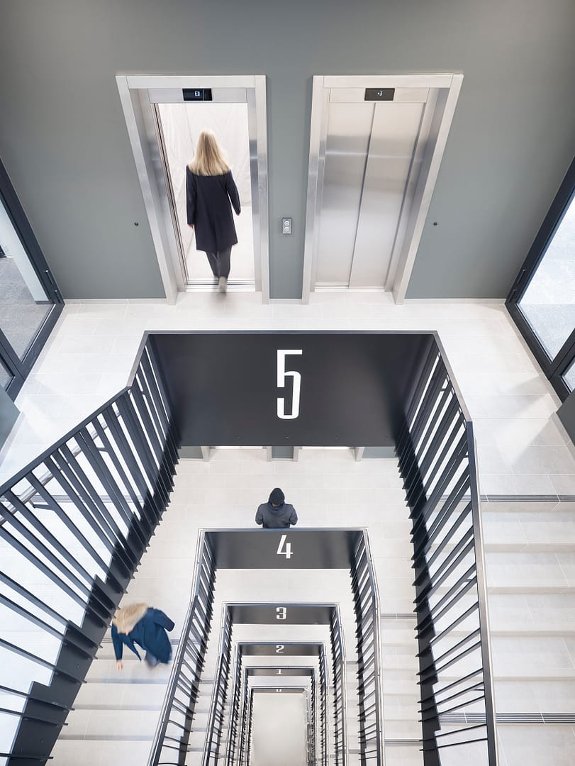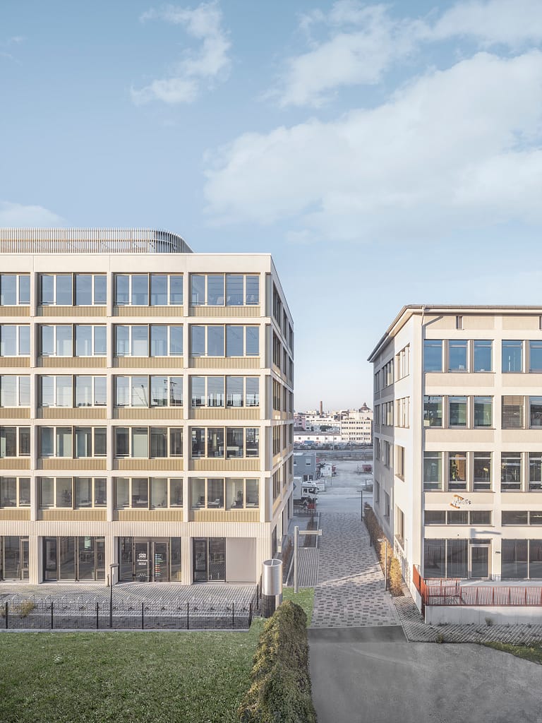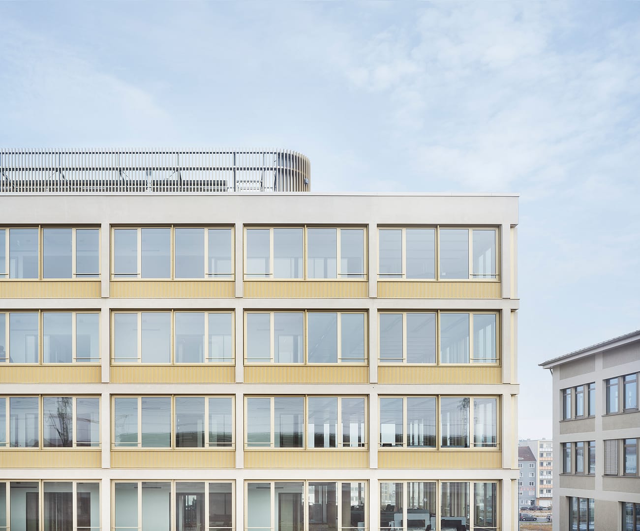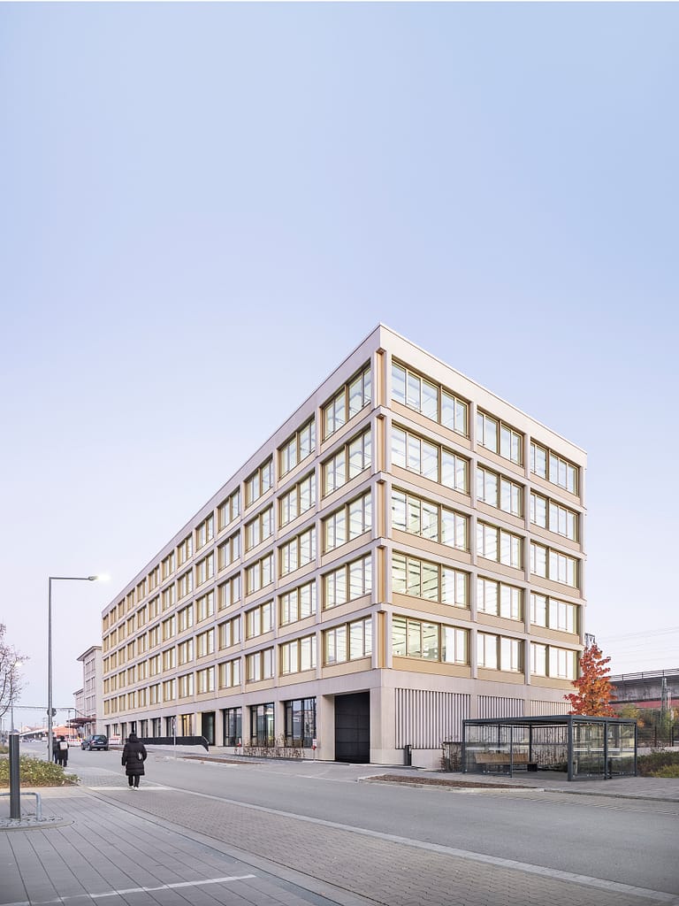 Das sachlich und raffiniert wirkende GÜTERWERK ist ein architektonischer Akzent, der das Quartierkonzept markant betont. Mit der Fassade aus Stahlbetonfertigteilen hat das Nürnberger Büro Baum-Kappler Architekten eine Analogie zum einst rein industriell genutzten Standort geschaffen. Brüstungsverkleidungen aus bronzefarbenem Profilblech verleihen dem sonst geradlinigen Gebäude eine facettenreiche Gestalt. Hinter der eleganten Hülle können auf fünf Obergeschossen und zwei abschließenden Dachterrassen moderne Arbeitswelten entstehen. Das Erdgeschoss mit raumhoher Verglasung bietet Idealbedingungen für repräsentative Gastronomie- oder Showroom-Konzepte. Eine eigene Tiefgarage mit rund 100 Stellplätzen und die direkte Nähe zur S-Bahn-Station Steinbühl bieten komfortable Mobilität.