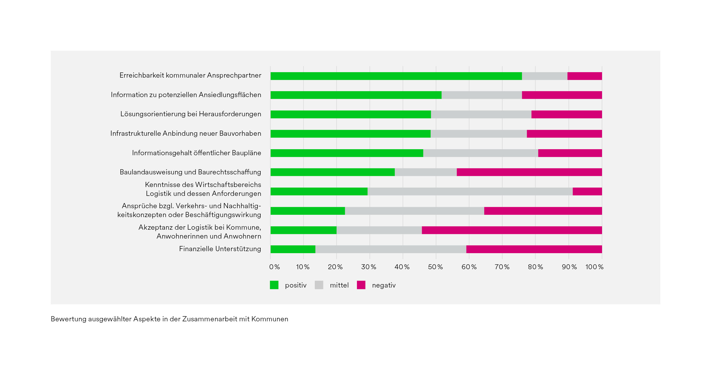 Negativ bewertet wurden hingegen mit ca. 45 Prozent die lokale Akzeptanz von Logistikprojekten bei den Kommunen, sowie mit 37 Prozent die schleppende bzw. fehlende Baulandausweisung und Baurechtschaffung.